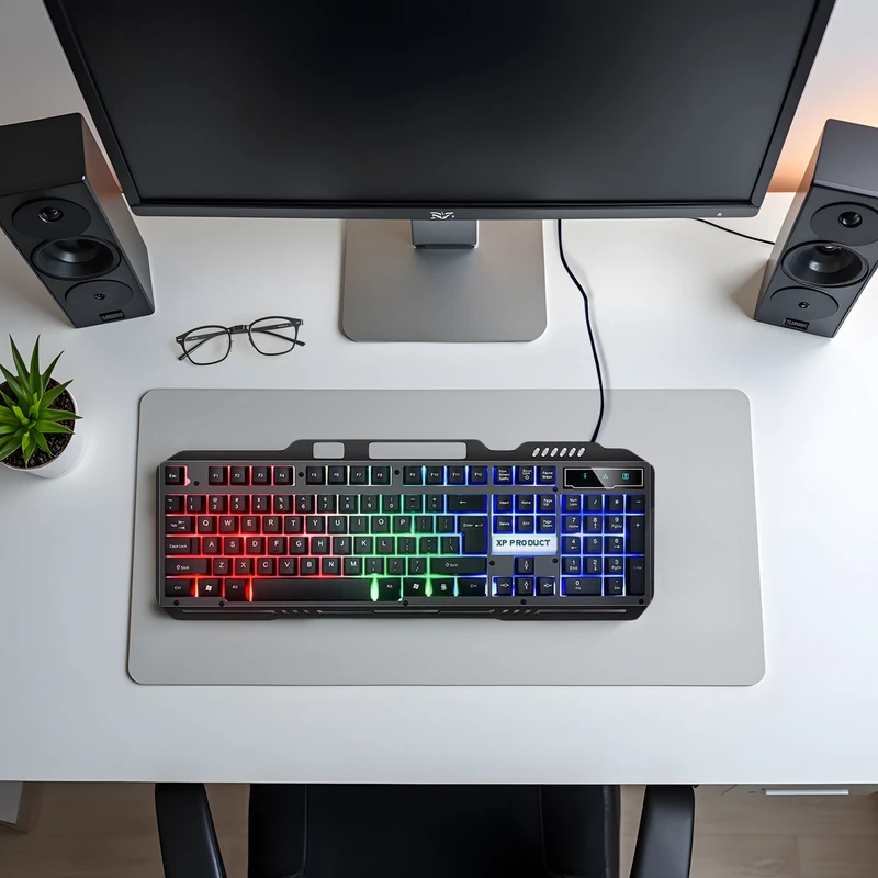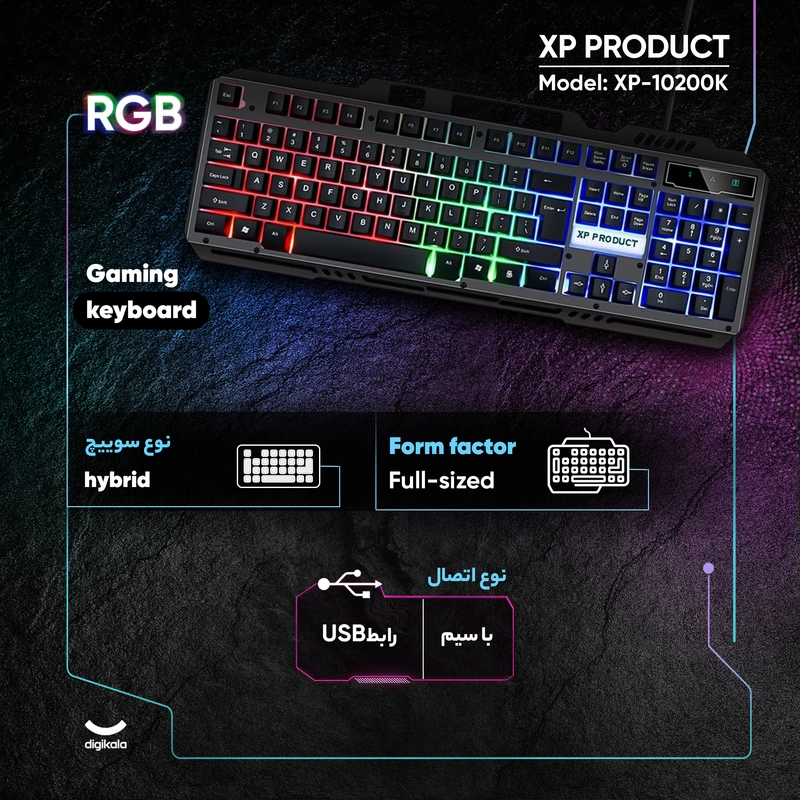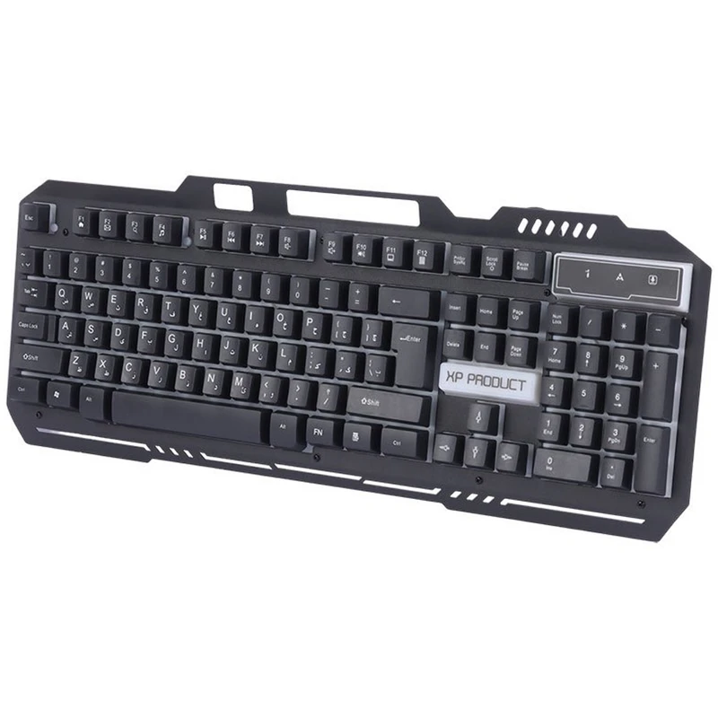 کیبورد گیمینگ ایکس پی پروداکت مدل XP-10200K با حروف، اعداد و علامتهای بزرگ و شفاف که روی کلیدها حک شدهاند، طراحی شده است تا به راحتی قابل خواندن باشند، بدون نیاز به دقت زیاد در هنگام استفاده. این کیبورد بهرهمند از کلیدهای استاندارد و نرمی است که به ندرت صدایی ایجاد میکنند، بنابراین تایپ با آن بسیار نرم، روان و تقریباً بیصدا است. این کیبورد دارای نور پس زمینه RGB یا همان بکلایت می باشد ، به کمک آن شما هنگامی که در شب نیاز به کیبورد دارید می توانید چراغ آن را روشن کنین تا تمام حروف را به راحتی مشاهده کنین ، همچنین روشن کردن چراغ پس زمینه کیبورد جلوه زیبایی به کامپیوتر های گیمینگ می دهد. پایههای خم شونده این کیبورد قابلیت تنظیم ارتفاع را فراهم میکنند، به طوری که شما میتوانید زاویه تایپ را به دلخواه تنظیم کنید. این کیبورد از طریق پورت USB به کامپیوتر متصل میشود و بدون نیاز به نصب هیچ نرمافزاری فعالیت میکند. همچنین، این کیبورد دارای ویژگی ضدآب است که امکان استفاده مطمئنتر در شرایط مختلف را فراهم میسازد. این کیبورد برعکس خیلی از کیبورد ها دکمه های مالتی مدیا ندارد و برای صدا و پخش موزیک باید از خود ماوس استفاده کنید و مستقیم نمی توان موزیک پلی کرد یا ایمیل باز کرد یا حتی کامپیوتر را خاموش کرد.